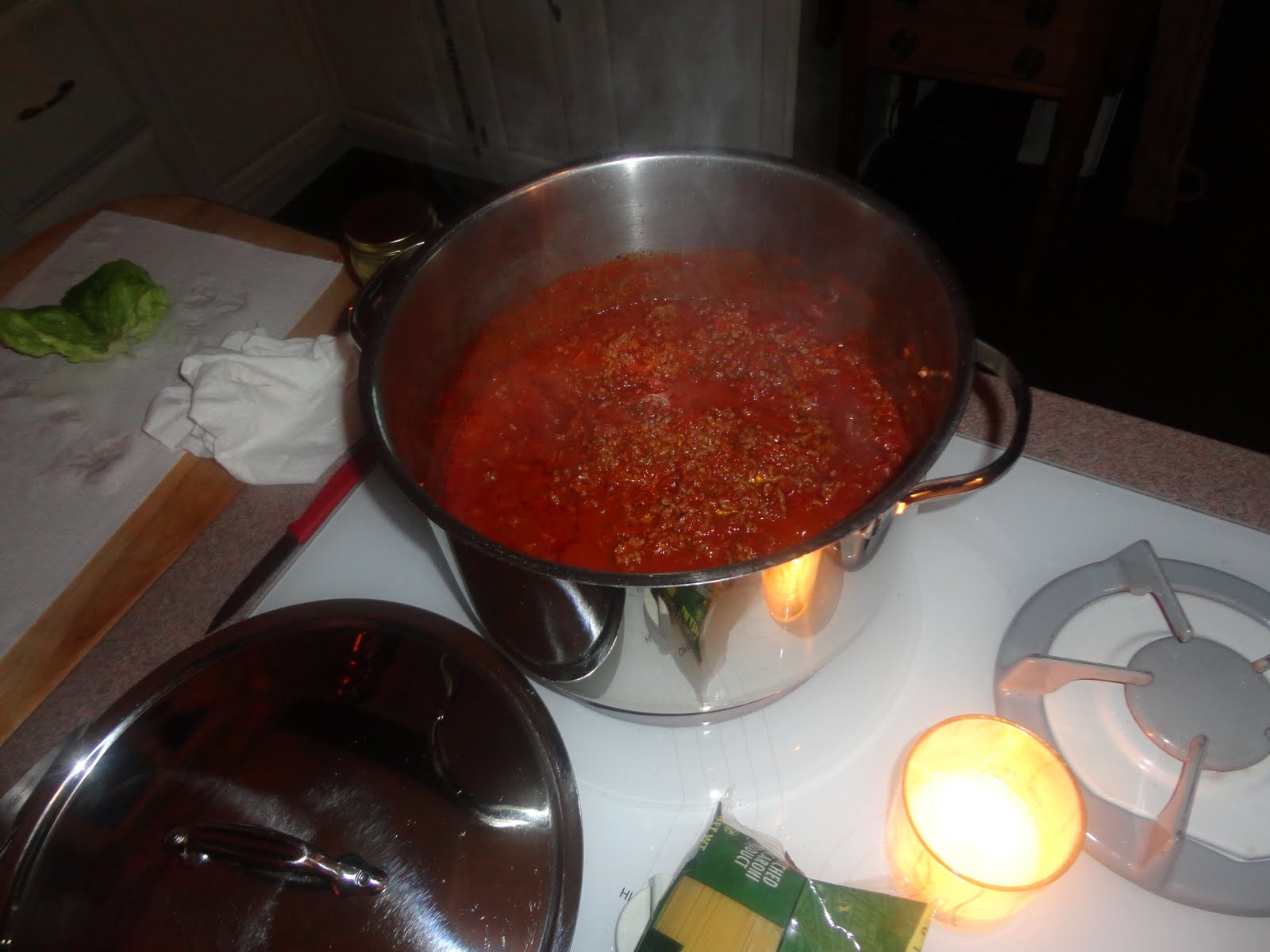 One of our first ice storm dinners was spaghetti. This was quick and easy to cook, and since we had been working hard all day and didn't have any time for cooking, it was perfect. We used my Mom's recipe.